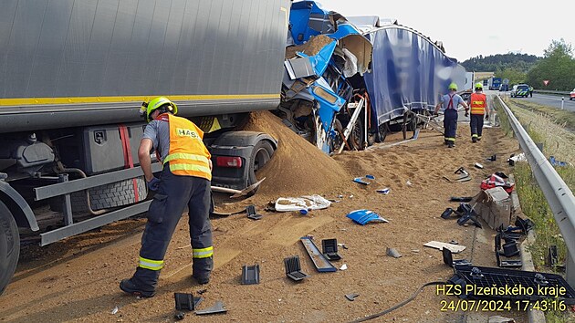 Dálnici D5 na 67,5 km ve směru na Rozvadov uzavřela ve středu odpoledne dopravní nehoda tří kamionů. Jeden z řidičů zemřel. (24. července 2024)