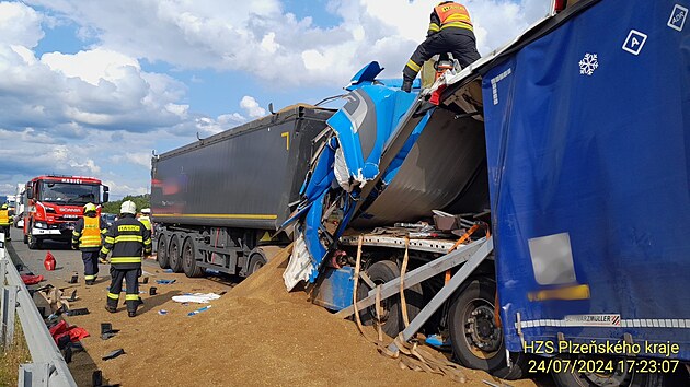 Dálnici D5 na 67,5 km ve směru na Rozvadov uzavřela ve středu odpoledne dopravní nehoda tří kamionů. Jeden z řidičů zemřel. (24. července 2024)