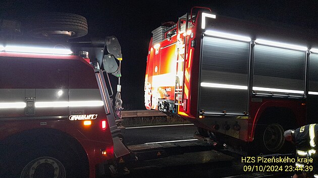 Do hasičského vozidla, které likvidovalo olej z nákladního auta, narazilo na dálnici D5 osobní auto. Jeho řidič zemřel na místě, druhý člověk je v kritickém stavu. (9. října 2024)