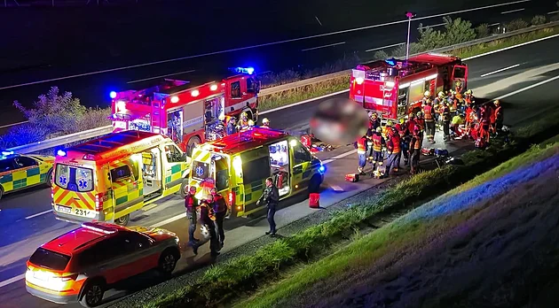 Do hasičské cisterny narazilo na dálnici D5 u Šlovic osobní auto. Řidič zemřel na místě, další člověk je v kritickém stavu. (9. října 2024)