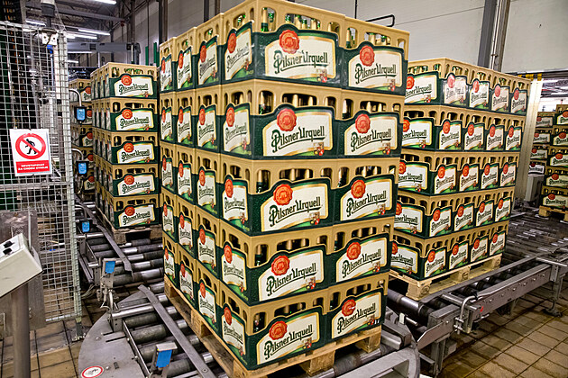 Nová třídička vratných lahví v Plzeňském Prazdroji. Dokáže strojově roztřídit lahve jeho vlastních značek od jiných pivovarů a odhalí případné poškozené lahve i přepravky. (23. 5. 2023)