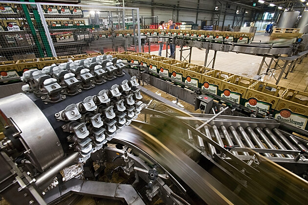 Nová třídička vratných lahví v Plzeňském Prazdroji. Dokáže strojově roztřídit lahve jeho vlastních značek od jiných pivovarů a odhalí případné poškozené lahve i přepravky. (23. 5. 2023)
