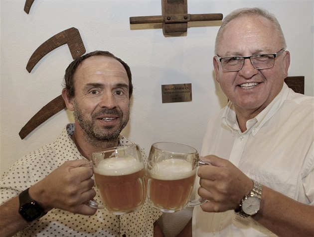 Plzeňský Prazdroj uvaří speciální várku piva Pilsner Urquell na počest Miloše Formana. Na slavnosti si spolu připili vrchní sládek Václav Berka (vlevo) a herec Petr Forman. (31. 7. 2018)
