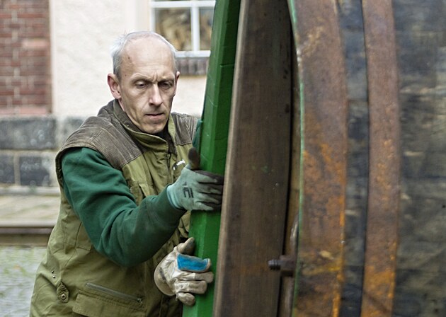 Bednáři z Plzeňského Prazdroje smolili velké ležácké sudy. (18. 10. 2022)