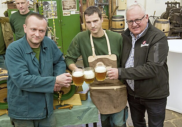 Novým členem plzeňských bednářů se stal Milan Kubizňák. Přivítal ho emeritní vrchní sládek Václav Berka (vpravo) a šéf bednářů Karel Hofman (vlevo). (18. 10. 2022)