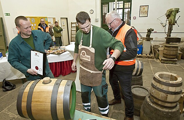 Emeritní sládek Václav Berka připevňuje koženou zástěru právě pasovanému novému bednáři Milanu Kubizňákovi. Vlevo vedoucí prazdrojské bednářské party Karel Hofman. (18. 10. 2022)