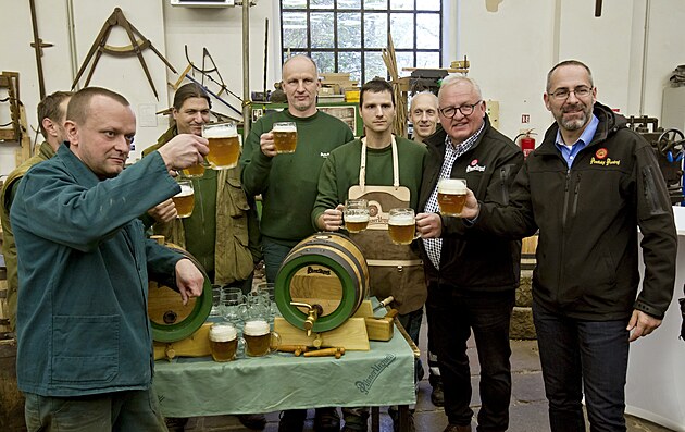Smolení dubových sudů v Plzeňském Prazdroji. Bednářská parta připíjí právě pasovanému novému bednáři Milanu Kubizňákovi (v kožené zástěře). Vedle něj vpravo emeritní sládek Václav Berka, zcela vlevo vedoucí prazdrojské bednářské party Karel Hofman. (18. října 2022)
