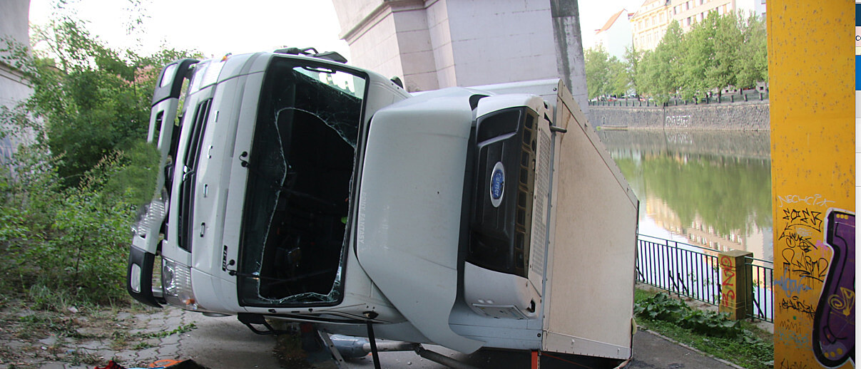 Řidič na Anglickém nábřeží zdemoloval značky i zaparkované auto. Skončil pod viaduktem.