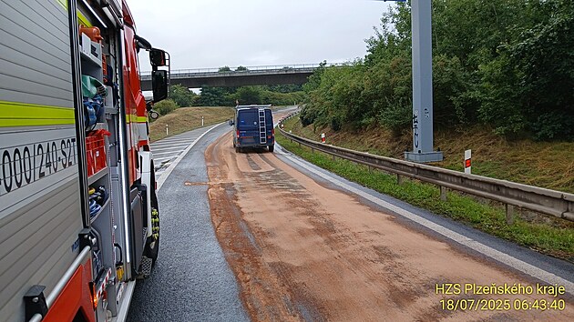 Naftu zasypali hasiči sorbentem. Přesto se na kluzké silnici stalo několik nehod.