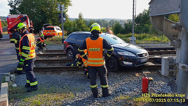 Auto se spícím řidičem skončilo v Třemošné těsně vedle železničního přejezdu. (15. července 2025)
