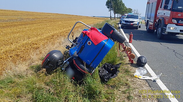 Při nehodě sajdkáry utrpěla její posádka vážná zranění. Na pomoc vzlétl i vrtulník z Prahy. (14. srpna 2025)