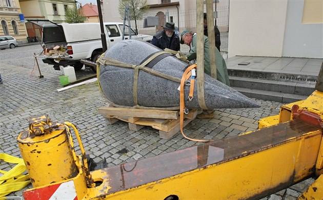 U kostela v Dobřanech usadili nový třítunový pomník obětem válek ve tvaru slzy (28. dubna 2015).