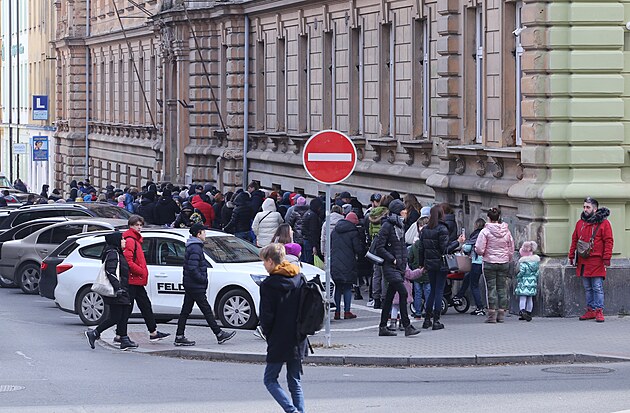Ukrajinští uprchlíci čekají na vyřízení vstupních formalit před budovou pracoviště odboru azylové a migrační politiky ministerstva vnitra v Plzni.