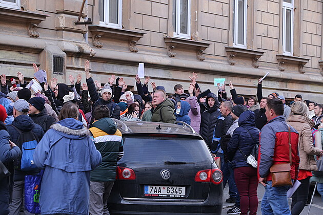 Ukrajinští uprchlíci čekají na vyřízení vstupních formalit před budovou pracoviště ministerstva vnitra odboru azylové a migrační politiky v Plzni. (2. 3. 2022)