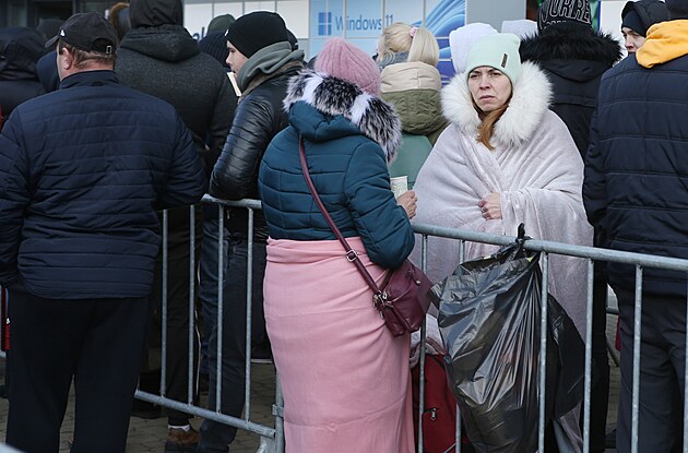 Ukrajinští uprchlíci čekají v dlouhé frontě před plzeňským centrem pomoci Ukrajině, který se nachází v bývalém obchodním domě Prior. (6. 3. 2022)