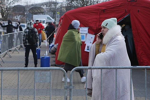Ukrajinští uprchlíci čekají v dlouhé frontě před plzeňským centrem pomoci Ukrajině, který se nachází v bývalém Prioru. (6. 3. 2022)