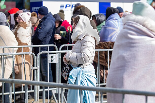 Ukrajinští uprchlíci čekají v dlouhé frontě před plzeňským centrem pomoci Ukrajině, který se nachází v bývalém Prioru. (6. 3. 2022)