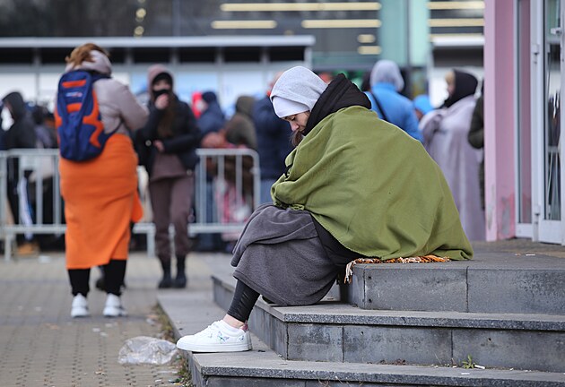 Ukrajinští uprchlíci čekají v dlouhé frontě před plzeňským centrem pomoci Ukrajině, který se nachází v bývalém Prioru. (6. 3. 2022)