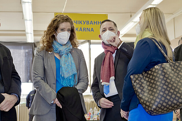 Americká chargé d affaires v ČR Jennifer Bachusová navštívila Krajské asistenční centrum pomoci Ukrajině v Plzni v bývalém obchodním domě Prior. Na snímku s hejtmanem Plzeňského kraje Rudolfem Špotákem. (8. 3. 2022)