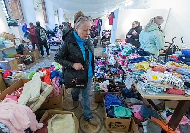 Ukrajinské ženy vybírají oblečení v Šatníku, skladu darovaného oblečení, který od března nově sídlí v Muzeu církevního umění plzeňské diecéze. (14. 3. 2022) FOTO: MAFRA: Petr Eret