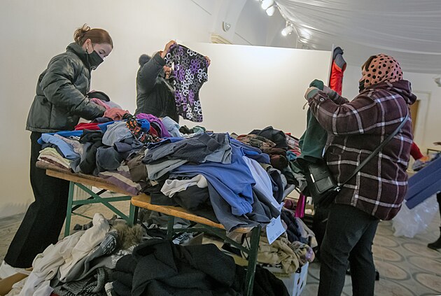 Ukrajinské ženy vybírají oblečení v Šatníku, skladu darovaného oblečení, který od března nově sídlí v Muzeu církevního umění plzeňské diecéze. (14. 3. 2022) FOTO: MAFRA: Petr Eret