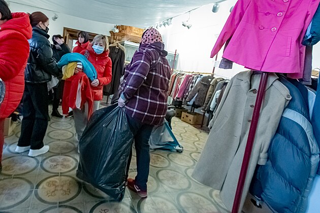 Ukrajinské ženy vybírají oblečení v Šatníku, skladu darovaného oblečení, který od března nově sídlí v Muzeu církevního umění plzeňské diecéze. (14. 3. 2022) FOTO: MAFRA: Petr Eret