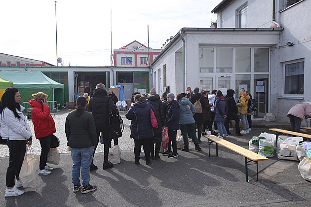Potravinové balíčky jsou k dispozici ukrajinským uprchlíkům v Humanitárním skladu Diecézní charity Plzeňv Cukrovarské ulici. (14. 3. 2022)