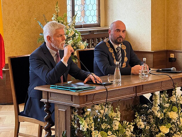 Prezident na plzeňské radnici spolu s primátorem Romanem Zarzyckým. (25. března 2025)