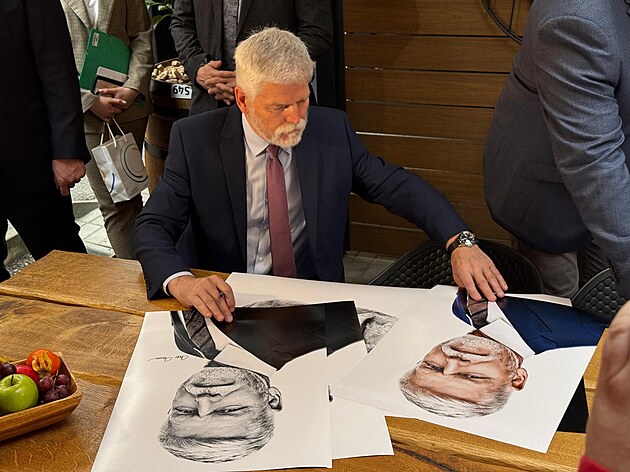 Prezident Petr Pavel a jeho choť Eva se v Bioptické laboratoři v Plzni podepisovali na plakáty. (25. března 2025)