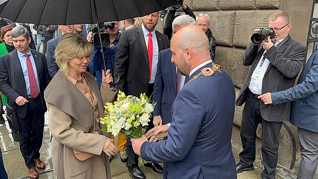 Prezidenta Petra Pavla a jeho choť Evu přivítal před radnicí primátor Plzně Roman Zarzycký. (25. března 2025)
