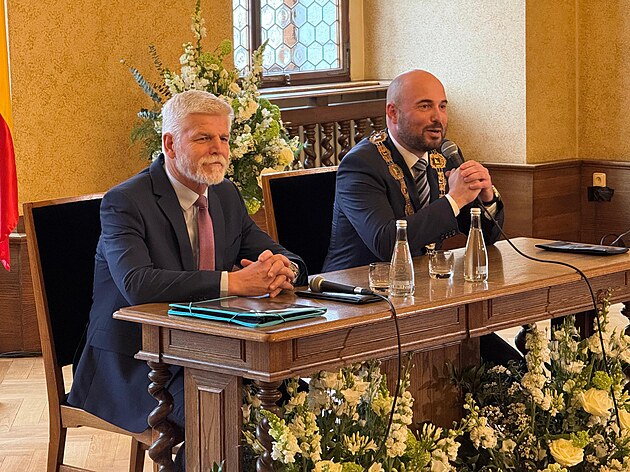 Prezident na plzeňské radnici spolu s primátorem Romanem Zarzyckým. (25. března 2025)