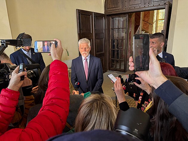 Prezident Petr Pavel na zámku Týnec na Klatovsku, kde se uskutečnil tiskový brífink pro novináře. (25. března 2025)