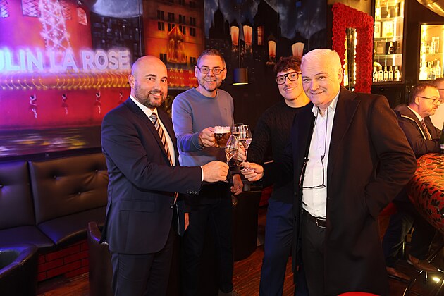 Volební úspěch. Hejtman a poslanec Kamal Farhan (vpravo) a primátor Plzně Roman Zarzycký (vlevo), oba z ANO, slaví. Preferenční hlasy je vystřelily z posledních míst na kandidátce až nahoru. (4. října 2025)