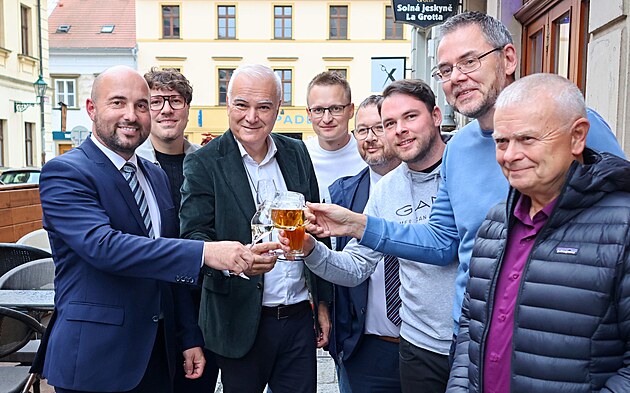 Volební úspěch. Hejtman a poslanec Kamal Farhan a primátor Plzně Roman Zarzycký, oba z ANO, slaví. Preferenční hlasy je vystřelily z posledních míst na kandidátce až nahoru. (4. října 2025)