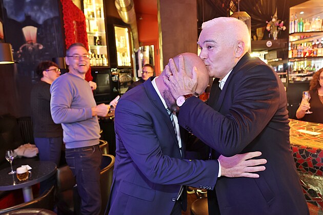 Volební úspěch. Hejtman a poslanec Kamal Farhan (vpravo) a primátor Plzně Roman Zarzycký (vlevo), oba z ANO, slaví. Preferenční hlasy je vystřelily z posledních míst na kandidátce až nahoru. (4. října 2025)