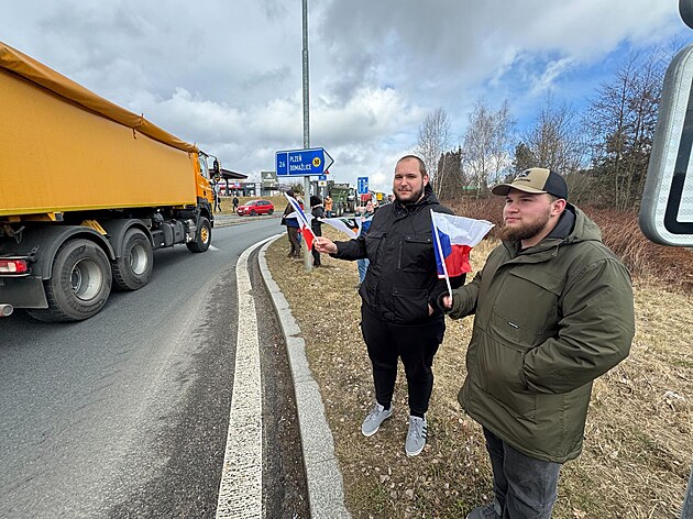 Na hraniční přechod Folmava na Domažlicku přijela kolona asi 30 traktorů a dalších vozidel protestujících zemědělců. Tam na ně čekaly desítky lidí. Cesta z vnitrozemí na hranici s Německem se obešla bez problémů. (27. února 2025)