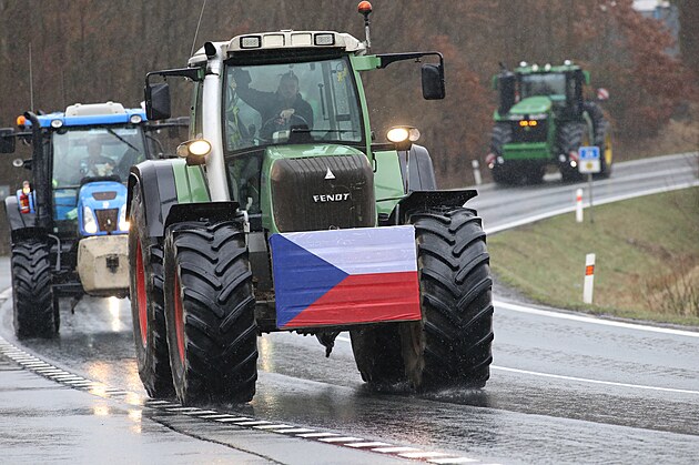 Zemědělci s technikou u hraničního přechodu s Německem ve Folmavě na Domažlicku. Protestující doprovázejí policisté. (22.února 2024)