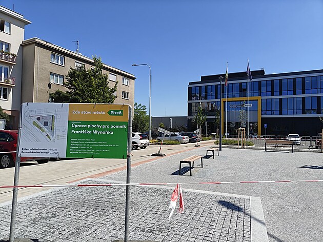 Pomník připomínající Františka Mlynaříka bude stát na ploše před ředitelstvím PMDP v Plzni na Slovanech. Místo se aktuálně upravuje. (20. června 2025)
