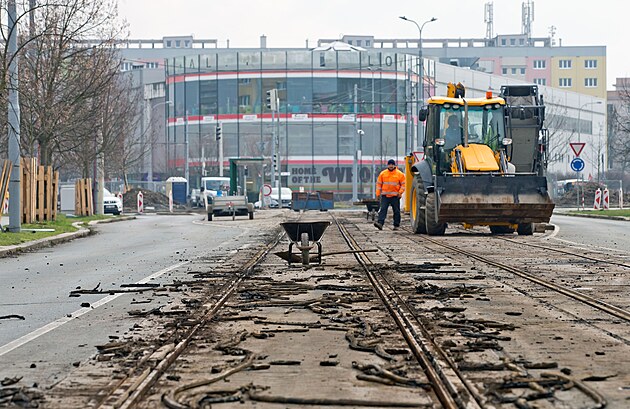 Rekonstrukce Koterovské ulice v Plzni potrvá od března do listopadu roku 2024. Na snímku dělníci demontují tramvajové koleje. (6. března 2024)