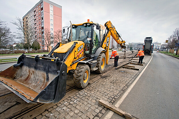 Rekonstrukce Koterovské ulice v Plzni potrvá od března do listopadu roku 2024. Na snímku dělníci demontují tramvajové koleje. (6. března 2024)