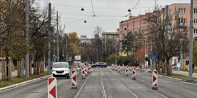 Stavbaři vpustili auta na část zrekonstruovaného úseku Koterovské ulice v Plzni. Oprava se zpožďuje, ani otevřený úsek není úplně dokončený. (12. listopadu 2024)