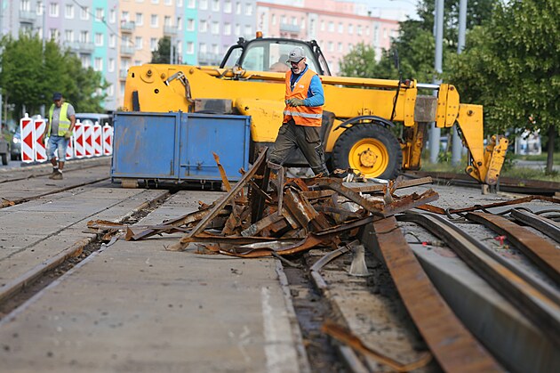 Rekonstrukce Koterovské ulice v Plzni-Slovanech pokračuje demontáží tramvajových kolejí. Práce tu potrvají až do konce letních prázdnin. (10. června 2022)