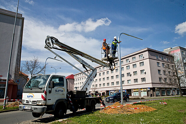 Dělníci osazují stožáry pro nové semafory na kruhovém objezdu na náměstí Generála Píky v Plzni na Slovanech. Mají umožnit přednost vjezdu pro autobusy. (21. dubna 2023)