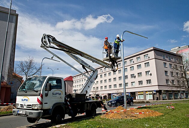 Dělníci osazují stožáry pro nové semafory na kruhovém objezdu na náměstí Generála Píky v Plzni na Slovanech. Mají umožnit přednost vjezdu pro autobusy. (21. dubna 2023)