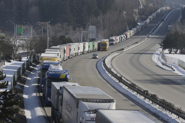 Kamiony stojící na dálnici D5 u Svaté Kateřiny na Tachovsku. (15.února 2021)
