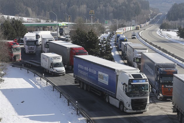 Kamiony stojící na dálnici D5 u Svaté Kateřiny na Tachovsku. Kolony vnikly v důsledku znovuzavedených kontrol na německé straně hranice. (15.února 2021)