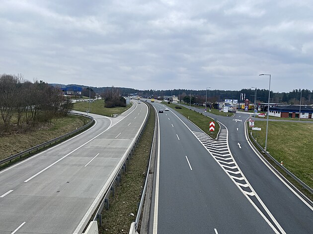 Dálniční přechod Rozvadov na hranici s Německem na dálnici D5. Parkoviště na výjezdu z České republiky i na příjezdu z Německa čekají velké přestavby. (7. března 2024)