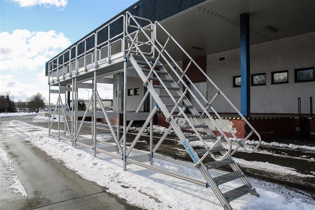 Lávka, ze které si řidiči kamionů mohou očistit sníh a led ze střechy svého vozidla, je k dispozici poblíž hraničního přechodu v Rozvadově. Je jediná svého druhu v ČR. (13. 2. 2021)