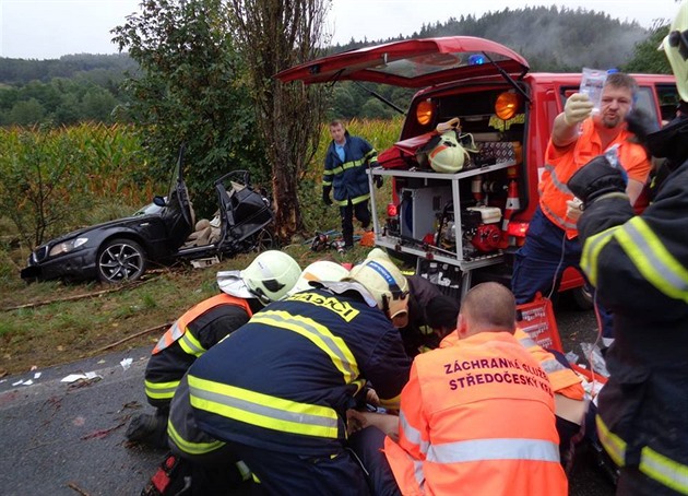 Ke zdemolovanému BMW přijeli jako první dobrovolní hasiči ze Zbiroha.
