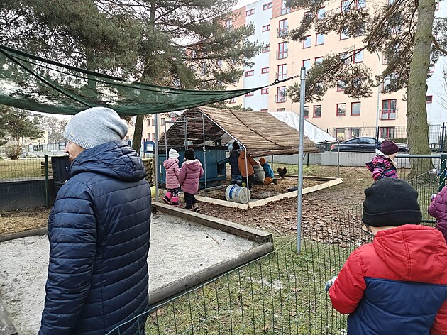 Slepičky přinášejí radost nejen dětem ze školky, ale i lidem z okolí. (27. listopadu 2025)